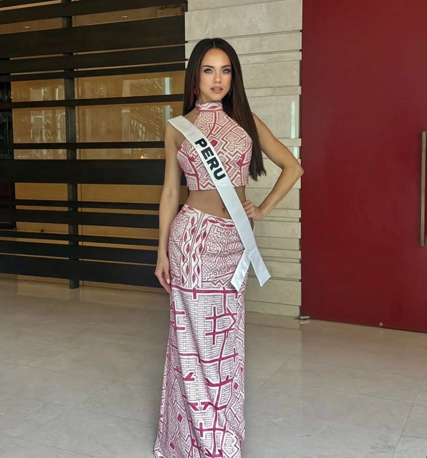 On the fifth day of the Miss Universe 2025 competition, Karla Bacigalupo, Miss Peru, chose Beneai once again as part of her wardrobe. This time wearing a two-piece set crafted from an extraordinary hand-embroidered textile created by Nayeli Gimenez Creo, an artist from the Beneai Collective. .